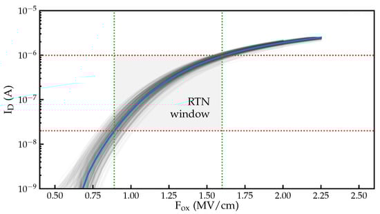 To obtain statistics about the defects active in the devices, automated measurements are performed on around 300 devices. In our measurement scheme, the transfer characteristic is recorded for each device, followed by RTN measurements. The initial () curve is used to verify proper operation of the tested device, to determine at which voltages the RTN signals are measured, and to map the recorded (t) RTN data to (t). In order to minimize stress to the device prior the RTN measurement, the initial () characteristics are recorded within a narrow gate bias window; see Figure 2.