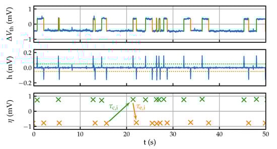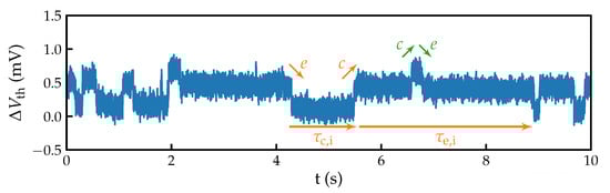 For each gate bias point, one long and five short RTN traces are recorded. The long traces feature a sampling time of and a total recording time of , while the short traces are sampled with for . This allows us to characterize defects with a wider range of transition times, while keeping the number of samples per trace manageable []. An example of a fast-sampled RTN trace recorded is shown in Figure 3. The trace was mapped from (t) to (t). For this, each value in the trace is replaced with the corresponding from the initial (), and finally subtracted from the applied [].