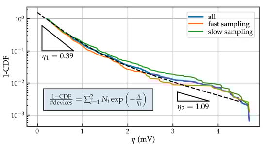 A plot showing the complimentary cumulative density function (1-CDF, or CCDF) of the step heights extracted from the measurement data of approximately 300 devices is shown in Figure 5. For a single defect distribution, an exponential distribution of step heights, i.e., a straight line in the CCDF plot, is expected []. In this case, however, the measurements seems to comprise two separate distributions of defects. As a consequence, defects with responses between 3 mV to 5 mV seem slightly more common than expected.