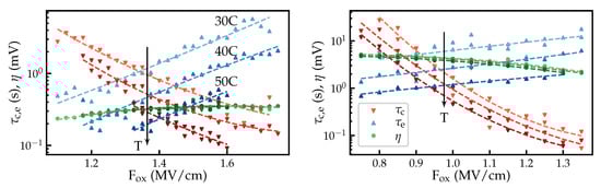 - Toledano-Luque, M.; Kaczer, B.; Roussel, P.; Cho, M.; Grasser, T.; Groeseneken, G. Temperature Dependence of the Emission and Capture Times of SiON Individual Traps after Positive Bias Temperature Stress. J. Vac. Sci. Technol. B 2011, 29, 01AA04. [Google Scholar] [CrossRef]