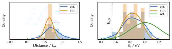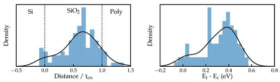 To obtain more accurate data, the capture and emission time behavior for a subset of the defects characterized using the estimation formulas is replicated using technology computer aided design (TCAD) simulation []. For the simulations, an effective two-state nonradiative multi phonon (NMP) model is used. Only those measurements are used where the intersection point lies within the measurement range. This removes the peak close to the interface observed in Figure 7 and Figure 8. The distributions for the resulting distances and energies are shown in Figure 9.