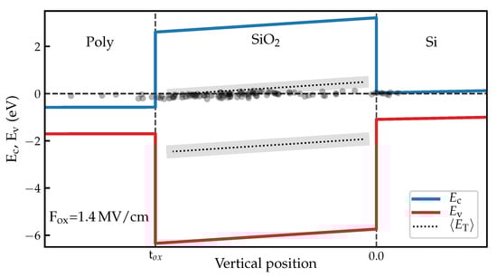 In Figure 8, the extracted defects are shown in a simulated band diagram. Furthermore, defect bands which were obtained from positive bias temperature instability (PBTI) and negative bias temperature instability (NBTI) experiments on n- and pMOS transistors, respectively, are indicated at energy values taken from [].