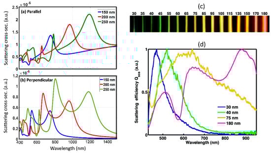 The interaction of electromagnetic fields with isolated sub-wavelength particles results in interesting linear light scattering which can be decomposed into basic electric and magnetic scattering modes. Plasmonic structures which rely on isolated, oligomeric and periodic array arrangement of metal sub-wavelength sized particles have been studied extensively over the last five decades []. Such structures rely on localized surface-plasmon resonances for field enhancement and find applications in fluorescence [,], Raman scattering [,,], and nonlinear optical studies [,,]. Plasmonic resonances result in multi-fold field enhancement with only electric multipolar characteristics and field localization outside the structure in order to satisfy the required boundary conditions. In similar lines to light scattering from metallic nanostructure, size-dependent resonant light scattering from dielectric nanostructures has also been studied []. The field enhancement in dielectric sub-wavelength structures is not as large as in plasmonic structures, however the field concentration inside the dielectric, the high damage thresholds and the robust scattering spectra has triggered interest in studying light scattering from dielectric particles in isolated and array form []. Figure 1a,b shows the simulated scattering spectrum from an isolated silicon cylindrical nanowire with varying diameter. Such isolated wires can be grown using chemical synthesis techniques and suspended in solution form [] or can also be defined using nano-lithography techniques []. Experimentally reported study of scattering spectra from silicon nanowires of varying widths is also shown in Figure 1c (from []). In this study, the size-dependent visible resonant scattering from the nanowires results in vivid colors obtained using dark-field imaging. The experimental and simulated scattering spectra in Figure 1 are found to be in good agreement. Figure 2a shows the simulated scattering cross-section from an isolated silicon nanosphere of 150 nm diameter, which is further decomposed into characteristic electric and magnetic resonances. The scattering spectra for a sub-wavelength spherical particle, expressed as scattering efficiency can be expanded as a superposition of characteristic electric and magnetic resonant modes as follows: []
