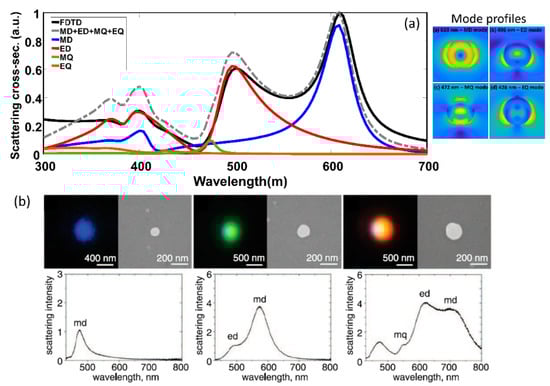 (a) Simulated scattering cross section (in arbitrary units–a.u.) for silicon nanospheres of fixed diameter of 150 nm (shown in black) and the result of decomposing the scattering spectra into magnetic dipole—MD (blue), electric dipole—ED (red), magnetic quadrapole—MQ (green) and electric quadrapole—EQ (brown). The sum of the MD, ED, MQ and EQ spectra is also shown (grey dashed). The field profiles for the MD, ED, MQ and EQ modes are also shown. (b) Experimentally obtained dark field scattering images and spectra for varying diameters of silicon sub-wavelength nanoparticles. (Figure b reproduced with permission from ref. []).