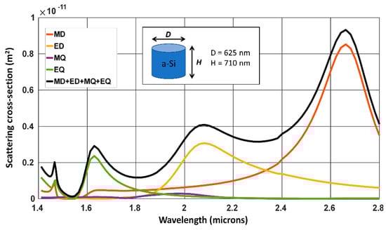 Scattering spectra from an isolated sub-wavelength cylinder separated into: magnetic dipole —MD (red), electric dipole—ED (orange), magnetic quadrapole—MQ (purple) and electric quadrapole—EQ (green). The sum of the MD, ED, MQ and EQ scattering spectra is shown in black.