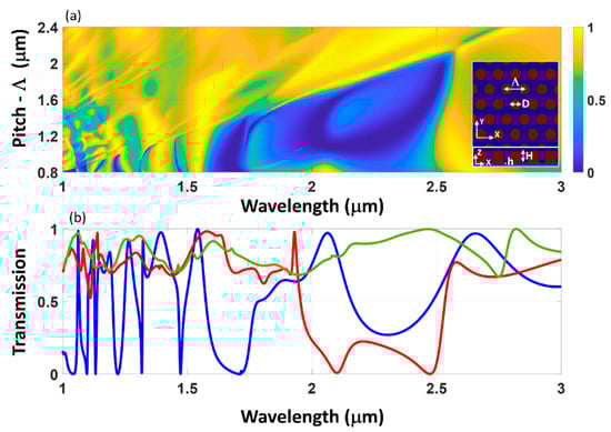 (a) Transmission spectra contour map for varying array pitch (Λ). The top view and side view profile of the hexagonal arrangement of sub-wavelength cylinders shown in the inset. The height and diameter of the structure are: H = 710 nm, h = 0 nm, and D = 625 nm. (b) Selected transmission spectra for pitch, Λ = 0.8 μm (blue curve), 1.2 μm (red curve) and 1.6 μm (green curve) are shown.