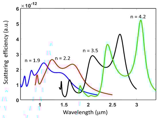 The refractive index of the sub-wavelength dielectric particle plays a critical role in determining the light scattering strength and hence its resonance characteristics. Figure 5 shows the scattering efficiency spectra for varying refractive indices for isolated dielectric sub-wavelength disk. A constant refractive index across the spectral range of interest and lossless dielectric medium are assumed in these simulations. The dimensions of the disk are same as in Figure 3. It is found that the contrast or sharpness of the resonances increases with increasing refractive index. This is associated with the higher quality factor of the resonance and stronger field concentration in the dielectric structure with higher refractive index. Furthermore, the scattering spectra is found to shift to longer wavelengths with increasing refractive index. This can be associated with the increased optical path length with increasing refractive index of the dielectric structure and its comparison relative to the wavelength range over which scattering is observed.