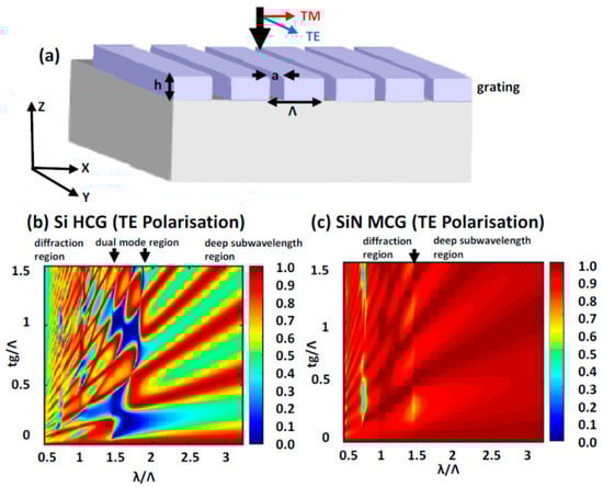 (a) Schematic of fully-etched dielectric one-dimensional grating structure. The simulated transmission spectra for (b) silicon high contrast grating and (c) silicon nitride medium contrast grating as a function of varying height for fixed incident TE polarization. The dimensions and wavelength are normalized by the pitch of the grating structure. (Figure is reproduced with permission from ref. []).