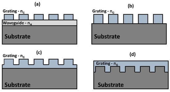 Guided-mode resonances arise in dielectric grating-waveguide coupled structures due to the evanescent diffraction orders from the grating coupling the incident electromagnetic wave into guided modes of the waveguiding layer. In other words, the optical resonances can also be described by the wavelength selective in- and out-coupling of electromagnetic wave into the waveguide through interaction with the grating structure. The waveguide can be either a separate high index layer located close to the grating structures or can be the grating structure itself which is fully or partially etched. Few examples of such structures which support guided-mode resonances in various waveguide-grating arrangement are shown in Figure 7. Here, we briefly outline some of the properties of periodic grating structures and demonstrated applications. Recent review articles provide a comprehensive overview of the recent advances in resonant waveguide grating structures [,].