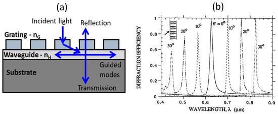 Wood anomaly in diffraction gratings has been studied in the past to explain the occurrence of sharp spectral orders in the diffracted light []. In particular, resonance type anomalies are explained based on leaky guided-modes supported in the waveguide grating structures. A basic waveguide-grating model used to describe the diffraction effect from the periodically index modulated structure leading to coupling of waveguide modes is shown in Figure 8a [,]. This model is adapted from the seminal paper by R. Magnusson et.al. [], which explained the working mechanism and applications of the guided-mode resonant structures. Under weak perturbation, the supported guided mode resonances can be understood based on the frequency-selective excitation of the modes of an effective waveguide formed by the periodically index modulated structure with the grating providing the required phase matching to couple the free-space incident light to the waveguide mode. Typical resonant filter characteristics obtained at normal incidence is shown in shown in Figure 8b []. Under weak index modulation, the filter reflection spectra are found to be strongly angle sensitive, as shown in Figure 8b. This offers a mechanism to angle-tune the filter characteristics. Such resonant response from waveguide-grating structures have been utilized as band-pass and band-stop filters working across different electromagnetic spectral regions. They have also been proposed to be used as intra-cavity narrow-band high-reflection mirrors, photorefractive tunable filters, and as electro-optic switches []. Guided-mode resonances have also found applications as bio-sensors in immune-assays in which local reaction between the functionalized antibody and the target antigen leads to a shift in the guided-mode resonance position [,,,]. Such assays have been proposed to be used in bright-field (colorimetric), fluorescence and also in wide-field imaging modes. In the context of nonlinear optics, the guided-mode resonance grating structure have been utilized as the nonlinear media in which the nonlinear optical interaction is enhanced due to the local electric-field built-up in the structure close to the resonance wavelengths. Some of these examples are discussed in Section 4 below.