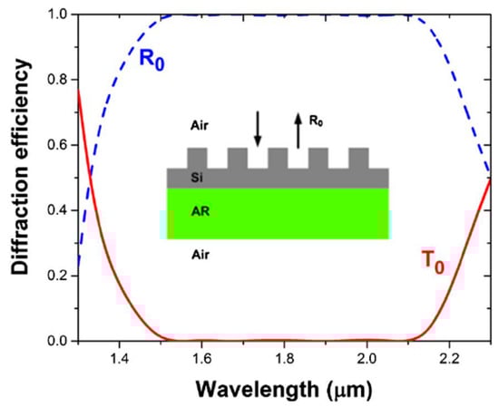 The simulated zeroth order reflection (R0) and transmission (T0) spectra for silicon zero-contrast gratings. The inset shows the cross-section of the zero-contrast gratings with the dimensions optimized using particle swarm combined with inverse-design algorithm. The optimized dimensions of the structure obtained are: etched grating height of 490 nm, unetched slab thickness of 255 nm, pitch of 827 nm, and fill factor of 0.643. (Figure reproduced with permission from ref. []).