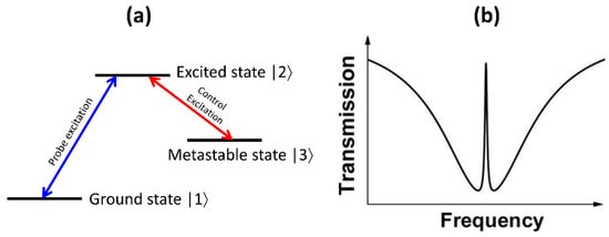 Optical resonances in photonic structures can be created due to interference between coupled resonances of varying quality factor. For example, a high-quality factor and low-quality factor resonance can couple together to result in the observation of analogues of electromagnetically-induced transparency (EIT) in photonic structures []. The electromagnetically-induced transparency effect can be understood based on quantum interference between two different path-ways to excite an upper energy level in a three-level system, as shown in Figure 11a. This system consists of a lower level, an upper level and a meta-stable state, as denoted in the figure. A probe field can control the transition from the lower to upper state, while a control field can control the transition from the excited state to metastable state. The direct transitions from the lower state to metastable state are forbidden. In this context, the transitions induced by the probe field can interfere with the indirect transitions from lower to upper state through interaction with the metastable state, in the presence of a strong control field. This can result in destructive interference of the probe field and results in the observation of peaks at the probe field frequency in an otherwise expected dip in transmission spectrum, as shown in Figure 11b. This phenomenon is hence termed as electromagnetically induced transparency. In the context of photonic systems, the low-quality factor and high-quality factor resonant modes are equivalent to the direct and indirect lower level to upper level transition respectively, as discussed above.