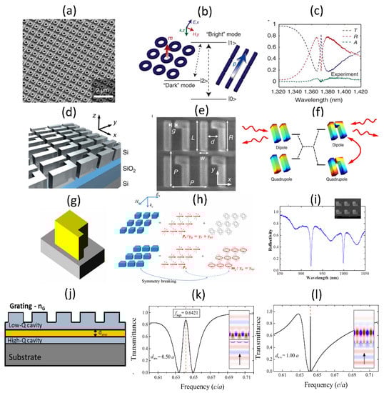 Photonic structures in the form of coupled Fabry-Perot cavities, coupled ring resonators, coupled photonic crystals etc. have been explored to be studied as EIT analogues []. In the context of arrayed metasurfaces and guided-mode resonant structures, there is also interest in coupling bright-mode and dark-mode resonances to observe EIT effects. Few examples of such implementations, supporting simulations and experimental studies are shown in Figure 12. Figure 12a–c shows an array of bar-ring structures in which the incident linearly polarized light preferentially couples to the bar and indirectly couples into the ring through the bar excited mode [,]. This results in excitation of dark modes in the ring, as shown in Figure 12b. The measured transmission spectra show peak in the middle of a broad transmission dip with strong field localization in the ring structures with maximum quality factor of the EIT resonance of ~300 times. Asymmetry in the array elements also results in coupling between bright and dark modes. Figure 12d–f shows one such example of rectangular bar dimer array with slight asymmetry added to one of the bars [,]. In this case, the coupling between the bright dipolar mode with the dark quadrapolar modes results in peaks in the transmission spectra (shown in Figure 12f) in the mid infrared wavelength region. Such structures have been used for enhanced infrared sensing []. Asymmetry can be introduced to the shape of a single monomeric unit as well to achieve bright-to-dark mode coupling. This is shown in Figure 12g–i, for the case of a nanocube with symmetry breaking protrusion []. As shown in Figure 12h, this protrusion results in the coupling of the electric dipole excitation, denoted as px to the magnetic dipole mode, denoted as mz. This coupling results in characteristic dips in the measured reflection spectra, as shown in Figure 12i. Such structures have been utilized for nonlinear optical process enhancement, as discussed in Section 4. In the context of guided mode resonances, there is interest in coupling a low- and high- quality factor resonant waveguide structure. Some examples of such structures are shown in Figure 12j–l. Some of the early simulation studies of these structures consisted of a top grating-waveguide layer coupled to another bottom waveguide layer, as shown in the inset of Figure 12j. In this case, the direct coupling of the incident light to the bottom waveguide and indirect coupling through interaction with the top-layer guided-mode resonant structure can occur. This results in a sharp transmission peak, which is different from the transmission spectra of an equivalent refractive index homogenous medium. Some of the early work [] was not even called an EIT analogue at that time. The EIT analogue ideas have been extended recently to one-dimensional and two-dimensional structures [,]. The spectral width of the EIT resonance and hence its overall quality factor can be engineered by choosing the separation between the top-layer grating-waveguide structure and the bottom waveguide layer. An example of such an engineered resonance shape is shown in Figure 12k,l. Such resonance shapes can potentially be used as narrow band-pass filters when compared to the more complex multi-layer dichroic filters.