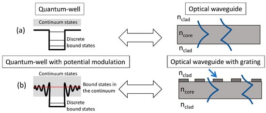Bound-states in continuum (BIC) represent another interesting class of high-quality factor resonance. BIC are bound states in an otherwise continuum of states, considered as a trapped state with embedded eigenvalue. Figure 13 shows a schematic representation of BIC states in quantum-well systems and comparison with analogous waveguide grating systems (figure adapted from ref. []). Figure 13a compares a conventional quantum well with a slab-waveguide. It is found that in a conventional quantum well, the allowed states within the quantum well are bounded by the steep potential walls of the quantum well. This results in discrete, bounded states within and a continuum of states outside. This can be compared with a straight, unperturbed slab waveguide with optical mode confinement achieved by the core-cladding refractive index profile. This results in discrete, bound modes within the waveguide and a continuum of radiation modes outside. When the sharp edges of the quantum well potential profile are replaced by a modulated potential profile, it is found that there can exist bound states even within the continuum, as shown in Figure 13b. In similar lines, the introduction of a periodic modulation to the waveguide using a grating structure results in the creation of bound-states within the continuum of radiation states. These states end up being forbidden from external excitation/ coupling due to symmetry considerations []. This lack of in- and out-coupling or non-radiating characteristic can result in ideal infinitely high-quality factor for these bound states within the continuum resonances. However, in practice one would consider quasi-BIC states which tend towards the ideal situation and can result in large, but finite quality factors with external excitation mechanism [,].