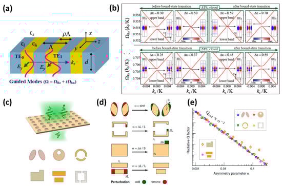 (a) Schematic of the periodic dielectric constant modulated grating structure with typical TE0 and TE1 modes supported by such structure. (b) Photonic band-structure calculation corresponding to the TE0 and TE1 modes showing the GMR and BIC states at either band-edge and their corresponding mode profiles. The GMR and BIC states are found to flip by changing the dielectric constant difference between the grating materials. (c) Examples of asymmetric resonant metasurfaces which support quasi-BIC resonances. (d) Modeling the asymmetricity using an asymmetry parameter, α. (e) Variation of quality factor of the quasi-BIC resonance with change in asymmetry parameter. (Figures a–b are reproduced with permission from ref. [], c–e are reproduced with permission from ref. []).