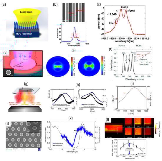 The wave-mixing processes can be considered as a general case of the above described harmonic generation processes. The processes of interest here are the four-wave mixing (FWM) and sum-frequency generation (SFG). In the case of FWM process, the nonlinear signal frequency is related to the incident light as follows: ω4 = ω1 + ω2 − ω3 []. Two pump frequencies (ω1 and ω2) being unique or identical are termed as non-degenerate and degenerate FWM processes respectively. The second-order SFG process satisfies the frequency relation: ω3 = ω1 + ω2, while degenerate third-order SFG process satisfies frequency relation of the form: ω3 = 2ω1 + ω2 or ω3 = ω1 + 2ω2 []. Figure 17a–c shows FWM enhancement observed for closely spaced pump-signal wavelengths in the telecom range for silicon-on-insulator based fully etched high-contrast gratings []. The sub-wavelength dimension high-contrast grating structures are found to support resonances with intensity enhancement of more than 8000 times and experimentally measured quality factor of ~7300. The signal and pump photons in close vicinity to this resonance results in FWM with the generation of idler with conversion efficiency of −19.5 dB as shown in Figure 17c. The use of high aspect ratio germanium (Ge) nanodisks to observe anapolar resonances [] and the enhancement of third-order sum-frequency generation processes is shown in Figure 17d–f []. The higher order anapolar mode profiles are chosen with good spatial overlap to ensure enhancement of the SFG process by about two-orders of magnitude, as shown in the SFG spectrum in Figure 17f. Silicon (Si) nanodisks that support magnetic and electric-dipole resonances have also been utilized for doubly-resonant enhancement of FWM process as shown in Figure 17g–i []. The individual resonance spectra and the corresponding resonance for the FWM are also shown, with approximately two-orders of magnitude enhancement. Doubly-resonant structures are promising to increase the FWM efficiency using both pump and signal resonances. However, the best enhancement can be obtained only when good overlap is ensured between the interacting resonant mode profiles. Detailed spatially-resolved imaging of four-wave mixing process in singly resonant partially etched zero-contrast grating structures is shown in Figure 17j–l []. The structures are designed to support resonance at the signal wavelength in the 1550 to 1600 nm wavelength range. Four-wave mixing images acquired across an area of 300 × 300 microns show clear dependence of the FWM image contrast on the incident signal wavelength. A maximum FWM enhancement of 450 times has been experimentally obtained [].