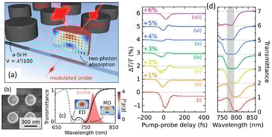 (a) Schematic of the nanodisk array used for ultrafast-optical switching studies. (b) Electron microscopy image and (c) transmission spectra for the nanodisk array with the corresponding dipolar modes marked. (d) Experimental results of pump-probe studied showing fast recovery or switching of probe in the presence of a resonant pump. Various pump laser wavelengths relative to the resonance are shown in the right plot. (Figures are reproduced with permission from ref. []).