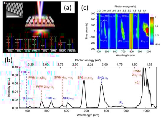 The nonlinear optical studies are not restricted to just the second and third-order nonlinear optical processes. With high enough incident light fluence and high quality factor resonant metasurface medium with strong optical nonlinearities, various higher order processes greater than third order can also be observed. This is shown in Figure 20a for a Gallium Arsenide based meta-mixer consisting of nanodisk array []. Such structures support magnetic and electric dipolar resonances, as shown in the inset of Figure 20a. These resonances at the incident excitation laser wavelengths can be leveraged to study various nonlinear optical processes from second- and third-harmonic to four-wave mixing to fourth-harmonic generation and even six-wave mixing processes. With a high sensitivity spectrometer, the various nonlinear processes are spectrally resolved in Figure 20b. The dependence of the various nonlinear processes on time-delay of the interacting waves is also shown in Figure 20c. Even though the overall conversion efficiency is small, this is a promising direction towards realizing complex wave-mixing processes on a small footprint platform. Further enhancement in efficiency can be achieved by improving the quality factor of the resonances [,,] or using such resonant structures in intra-cavity configuration [].
