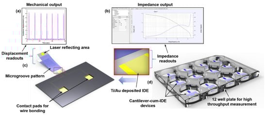 Schematic of the device and its working principle. (a) Cantilever displacement measured by the laser vibrometer with the help of laser reflecting area at the end of the cantilever. Output can be viewed in LabVIEW (version 9.0), (b) impedance spectrum measured from interdigitated electrode array (IDE) with the help of IviumStat software, (c) schematic of the cantilever device denoting positions of IDEs on the cantilever, microgrooves, laser reflecting area and contact pads for wire bonding, (d) schematic of the cantilever devices in a 12 well culture plate for high throughput measurement.
