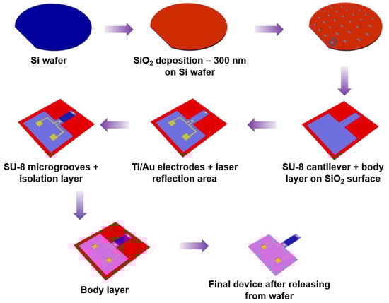 - Oyunbaatar, N.E.; Shanmugasundaram, A. Micro-patterned SU-8 cantilever integrated with metal electrode for enhanced electromechanical stimulation of cardiac cells. Colloid Surf. B 2020, 186, 110682. [Google Scholar] [CrossRef]