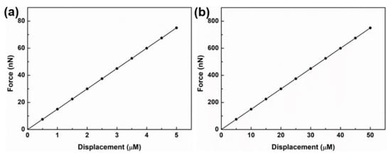 The next step is to characterize the contraction force experienced by the cantilever. As is well known, the contraction force generated by cardiomyocytes is so small that the cantilever needs to be highly sensitive in order to measure the force. In our case, first the displacement experienced by the cantilever is first measured, and then convert it to force by using the calculated value of spring constant. Spring constant of our cantilever (6 mm × 2 mm × 15 µm) is 0.015 N/m. As we can see from Figure 3, the force changes almost linearly with respect to cantilever displacement. When an external force is applied to a cantilever and it undergoes displacement, a part of the cantilever on one side of the neutral axis undergoes compression while the other part undergoes tension. The neutral axis is the axis where there is no effect of applied force. The data obtained experimentally demonstrate that our device exhibits wide range of detection limits ranging from 7.5 nN for 500 nm displacement, and 750 nN for 50 µm displacement. This shows that this device is sensitive enough to detect even smaller variation in the displacement of the cantilever caused by contractile force of the cardiomyocytes.