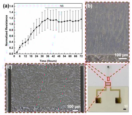 (a) Normalized resistance measured for up to 72 h, (b) Optical image of distribution of cardiomyocytes on microgroove-patterned cantilever and (c) on the IDEs. Scale bar on the device image is 1 mm.