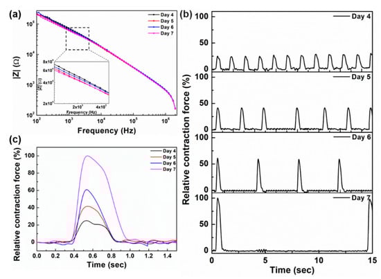 (a) Bode plot of the impedance spectrum measured from day 4 to day 7 after cell seeding, (b) normalized contraction force from day 4 to day 7 after cell seeding, (c) overlapped curves of contraction force from day 4 to day 7.