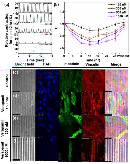 The obtained data is further justified by immunocytochemistry (ICC) staining experiment. Figure 6c–f shows the bright-field, DAPI (blue), α-sarcomere actinin (green), Vinculin (red) staining and merged images for control, 150 nmol/L, 300 nmol/L and 1000 nmol/L concentrations of Verapamil. The ICC staining experiments were performed 12 h after addition of the drugs. The number of cells gradually decrease from control to 150 nmol/L and to 300 nmol/L, and significantly decrease in case of 1000 nmol/L Verapamil (DAPI). α-actinin shows the sarcomere lengths aligned to the microgrooves. Similarly, as can be seen from Vinculin staining, the focal adhesion with the substrate is decreasing as the drug concentration increases. This data can be correlated with our impedance readouts, that depict decreasing cell index. In a cell, vinculin is connected to a talin filament, which in turn is attached to the integrin filament that adheres to the extracellular matrix []. On addition of Verapamil, the integrin expression decreases []. This subsequently leads to decrease of Vinculin expression and the total number of cells (DAPI).