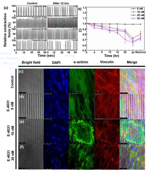 (a) Normalized contraction force on addition of E-4031 of concentrations 5 nmol/L, 10 nmol/L, 20 nmol/L, 30 nmol/L after 12 h, (b) Normalized impedance output on addition of E-4031 of concentrations 5 nmol/L, 10 nmol/L, 20 nmol/L, 30 nmol/L up to 24 h. (c–f) ICC staining data for (c) control, (d) 5 nmol/L, (e) 10 nmol/L, (f) 30 nmol/L E-4031. Scale bar = 25 µm.