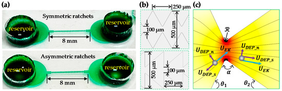 where is the dielectrophoretic particle velocity, with the subscripts and denoting, respectively, the normal and stream-wise directions; is the streamwise electrokinetic velocity; and the product measures the working distance for the cross-stream particle DEP, with and being the curvature radius and opening angle (in the unit of radians) of the ratchet tip (see Figure 1c), respectively. Note that velocity magnitudes are used in Equation (1) because both and can be positive or negative. It is also important to point out that the particle deflection in Equation (1) is not a constant because both and vary with the particle position.
