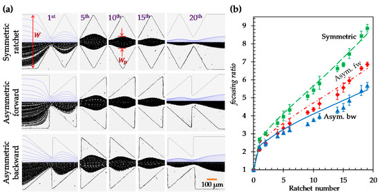 Effect of ratchet structure on the dielectrophoretic focusing of 5 µm diameter particles: (a) Comparison of the experimentally obtained and numerically predicted (top half of the left- and right-most images only) particle trajectories (traveling from left to right) at varying locations of the microchannels with symmetric (top row), asymmetric forward (middle row), and asymmetric backward (bottom row) ratchets, respectively; (b) Comparison of the experimentally measured (symbols with error bars) and numerically calculated (curves) particle focusing ratios, defined as the channel width, , over the particle stream width, (see the highlighted dimensions in (a)), among the three ratchet structures.