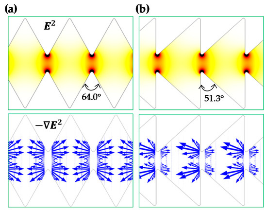 The comparison of the particle focusing ratios among the three ratchet structures is illustrated in Figure 2b. A good agreement between the experimental and numerical data is obtained in every ratchet structure. The focusing ratio exhibits an approximately linear (with a positive correlation) relationship with respect to the ratchet number (except for the zeroth ratchet, where particle DEP ceases). The slope of the linear trendline for the data points (excluding that at the zeroth ratchet) is approximately 0.34 for the symmetric ratchets. This value is 42% greater than the slope of the linear trendline (≈0.24) for the asymmetric forward motion and 79% greater than that (≈0.19) for the asymmetric backward motion. We attribute the strongest particle focusing effect in the symmetric ratchet microchannel to: (1) the larger opening angle, (= 64.0°), of the ratchet tip in Equation (1) (see Figure 3a) than that (= 51.3°) in the asymmetric ratchet microchannel (see Figure 3b), and (2) the smaller discrepancy in the upstream and downstream particle dynamics as demonstrated by the symmetry of the electric field (squared) and DEP before and after the ratchet tips in Figure 3. In between the two asymmetric ratchet structures, particle DEP becomes highly asymmetric on the two sides of the ratchet in Figure 3b. Specifically, for the asymmetric forward motion, an increase in the DEP on the side of the ratchet with a normal surface to the microchannel (i.e., the upstream side of the ratchet) significantly enhances the particle deflection because it increases in the numerator while decreasing the particle velocity, , in the denominator of Equation (1). By contrast, for the asymmetric backward motion, a stronger DEP on the downstream side of the ratchet does not necessarily enhance the particle deflection because it increases both in the numerator and the particle velocity, , in the denominator of Equation (1).