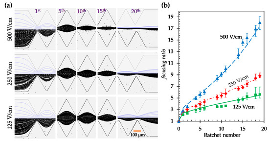 Effect of the electric field on the dielectrophoretic focusing of 5 µm diameter particles in the symmetric ratchet microchannel: (a) Comparison of the experimentally obtained and numerically predicted (top half of the left- and right-most images only) particle trajectories (traveling from left to right) at varying locations of the microchannel under 125 (bottom row), 250 (middle row), and 500 V/cm (top row) electric fields, respectively; (b) Comparison of the experimentally measured (symbols with error bars) and numerically calculated (curves) particle focusing ratios among the three electric fields.