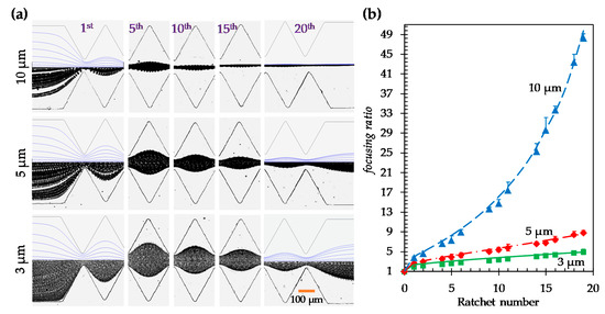 To quantify the ratchet structure’s effect on particle focusing, we define a dimensionless focusing ratio as the microchannel width, , over the particle stream width, (see the highlighted dimension on the particle image in Figure 2a):
