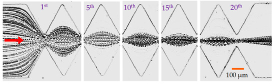 To demonstrate the potential biological applications of the passive dielectrophoretic particle focusing method, yeast cells were chosen to replace 5 μm polystyrene particles in a test with the symmetric ratchet microchannel. The superimposed images in Figure 6 show the development of cell focusing along the microchannel under the application of a 250 V DC voltage (i.e., a 312.5 V/cm electric field, on average, over the entire channel length). Since the size of yeast cells is not homogenous, the observed cell focusing is slightly worse than that of 5 μm particles (see Figure 2a). The application of the DC electric field may affect the viability of yeast cells via Joule heating-induced temperature elevation [57] and/or electrical field-induced transmembrane voltage [58]. For the former, we did not notice any significant increase in the electric current through the buffer solution in the microchannel, which indicates an insignificant Joule heating effect during the focusing experiment [49]. To check the impact of the electrical shock, we conducted a viability test using trypan blue, which can stain non-viable cells blue while viable cells remain unstained. Specifically, 100 µL yeast cell suspension was taken from the outlet reservoir of the ratchet microchannel and stained with trypan blue in 1:1 ratio. A hemocytometer slide was then filled with the stained cell suspension and incubated at room temperature for 1–2 min. Live and dead cells were counted under a microscope, and the viability was calculated by dividing the number of live cells by the total number of cells. We confirmed that more than 98% of the yeast cells still remained alive after the dielectrophoretic focusing experiment.