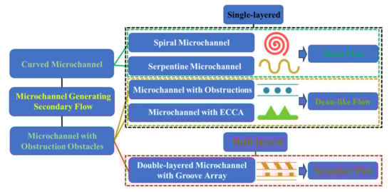 Category illustration of microchannels using secondary flow. There are five typical types of microchannels summarized in our work, which can generate secondary flow through the curved channel or obstruction obstacle. They are the spiral microchannel, serpentine microchannel, microchannel with expansion-contraction cavity array (ECCA), microchannel with obstructions and double-layered microchannel with groove array. The single-layered microchannel generates the specific type of secondary flow, Dean flow and Dean-like flow, to control particle movement, whereas the multilayered microchannel induces complicated irregular secondary flow.