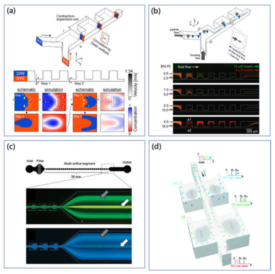 Meanwhile, in order to remove sheath flow to simplify the flow control, Park et al. developed the sheathless particle-manipulation method using the double-sided expansion-contraction cavity array microchannel [78]. The multiorifice microchannel could focus particles at two equilibrium positions on both sidewalls. Here, the particle equilibrium position was found to be affected by particle size and flow condition as well. Large particles were focused on the equilibrium position at the centerline, while small particles were located on the equilibrium positions on both sidewalls (Figure 4c) [76]. This size-based microfluidic particle-manipulation method was defined as multiorifice flow fractionation (MOFF). Furthermore, Sim et al. proposed a multistage multiorifice flow fractionation (MS-MOFF) device to improve the recovery rate and reduce the loss of purity through retreatments on particles [79]. The obtained recovery rate was found to increase from 73.2% to 88.7%.