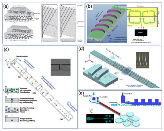 (a) Lateral deterministic migration-based WBC separation using the low aspect ratio straight microchannel with discontinuous slant array (DSA) [100]. Adapted with permission from Kim et al. (b) High-throughput, sheathless, magnetophoretic sorting of magnetic and nonmagnetic particles using the grooved microchannel [101]. Adapted with permission from Yan et al. (c) Three-dimensional, sheathless and high-throughput particle single-streamline focusing method using the stepped microchannel [102]. Adapted with permission from Chung et al. (d) Sheathless, high-throughput and three-dimensional particle-focusing method using a double-layered microfluidic device consisting of the low aspect ratio straight channel and arc-shaped groove array pattern on the top surface [103]. Adapted with permission from Zhao et al. (e) Enhanced sheath flow-assisted particle-focusing and separation method eliminating size limitation of conventional design [104]. Adapted with permission from Zhao et al.
