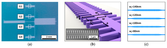The employed 1D PC corrugated waveguides have been fabricated on a silicon-on-insulator (SOI) wafer employing e-beam lithography (EBL) and inductively coupled plasma etching of the top silicon layer (see Figure 1a). The parameters of the 1D PC structures are the following (see Figure 1b); height (h) of 220 nm, width (w) of 460 nm, period (a) of 380 nm, transversal elements length (we) of 1500 nm, and four possible transversal elements widths (wi): 140, 120, 100, or 80 nm. In order to improve light coupling to/from the 1D PC structures and the input/output single mode waveguides (also with a width of 460 nm), a 5-element taper was included. These silicon integrated 1D PC structures are highly compact (footprint below 50 µm2), thus offering the opportunity to create arrays of sensors within the same photonic chip. Accordingly, in this work, we have designed a photonic chip containing 16 PC sensing structures distributed in 4 groups (named G1, G2, G3, and G4) of 4 PC sensors with the different wi parameters previously indicated (see Figure 1c). Besides the PC sensors groups, alignment reference waveguides were also included in the chip. All the photonic structures within the chip were accessed at the input and the output via 70-nm-deep shallow etched 1D grating couplers.