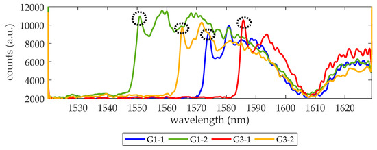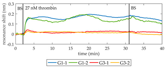 We begin trying to demonstrate the detection of a thrombin concentration of 27 nM (1 µg/mL), a value that is near the upper concentration of the initiation phase [4]. To this aim, the surface of the PC sensing structures in the chip is biofunctionalized as described in Section 2.3. Then, the microfluidic cell is attached to the photonic chip and the optical response of each sensing structure is checked while flowing 1× PBS. In this chip (hereafter referred as experimental chip), only PC sensors groups G1 and G3 have an acceptable transmission spectrum and are considered in the experiment. From these two PC groups, only the sensing response of the PC structures with wi values 140 nm and 120 nm are monitored as their PBG edges are in the working wavelength range of the laser (from 1520 to 1630 nm) and have a well-defined edge shape (see Figure 2). Hereafter, the monitored PBG edges from PCs group G1 will be referred as G1-1 (wi = 140 nm) and G1-2 (wi = 120 nm) and those from PCs group G3 will be referred as G3-1 (wi = 140 nm) and G3-2 (wi = 120 nm). While flowing 1× PBS, the noise of the set-up was also characterized and a value of 8.9 pm was obtained.