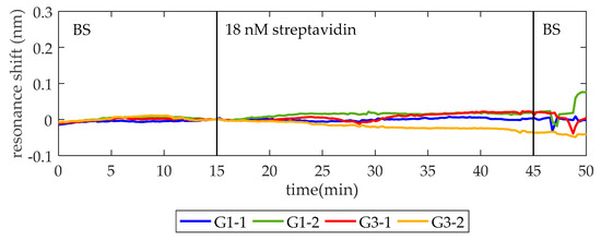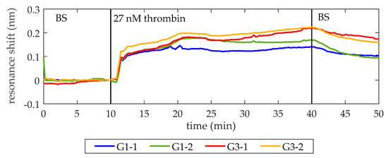 Once the lack of unspecific recognition is demonstrated, the BS is flowed again. When a stable baseline (i.e., centered in zero for at least 2 min and with a standard deviation below setup noise) is achieved, a solution of 27 nM thrombin in BS is flowed over the PC structures. As shown in Figure 4, a shift of PBG edges towards longer wavelengths is produced, indicating the binding of thrombin to the aptamers on the surface. Finally, BS is flowed again to remove the excess of thrombin. The average net shift of G1-1 and G1-2 is 97 pm, whereas the average net shift of G3-1 and G3-2 is 166 pm. The differences between PCs groups can be attributed to two factors. First, a different density of bioreceptors on their surface [29,30]. The biofunctionalization process is carried out manually, which might imply errors related to the manipulation of the materials employed, humidity, and temperature changes of the room and the precision when dropping the TBA solution over the PC structures. Second, slight structural differences between PCs groups are also expected due to the inherent limitations of EBL technique when fabricating the smallest features of the photonic chip [31]. These structural differences might be influencing the optical response of the PC structures and their sensitivity.