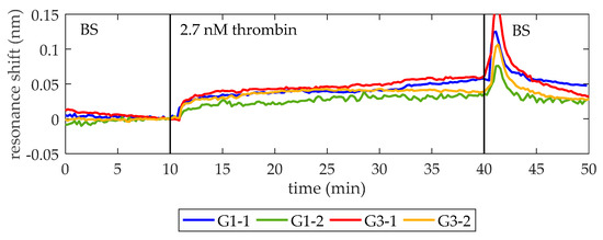 Once it was demonstrated that the optical aptasensor is able to specifically detect a thrombin concentration as low as 27 nM, the next objective is to detect a thrombin concentration near the lower concentration limit of the initiation phase (i.e., ~1 nM). With this aim, the experimental chip is regenerated using the protocol explained in Section 2.4 and biofunctionalized again as exposed in Section 2.3. Figure 6 shows the sensing results obtained when a 2.7 nM thrombin solution in BS is flowed over the photonic sensing chip (a ten-fold lower concentration with respect to previous experiments). Note that the thrombin is clearly detected despite its low concentration, providing average net shifts of 39 pm and 30 pm for PCs groups G1 and G3, respectively. In this occasion, differences between PCs groups are mainly due to the slightly higher desorption observed for G3-1 when BS is flowed again. As the photonic chip and the microfluidic chamber are the same employed for the detection of 27 nM thrombin solution, this different behavior can be ascribed to heterogeneities in the manually performed biofunctionalization process, as previously explained.