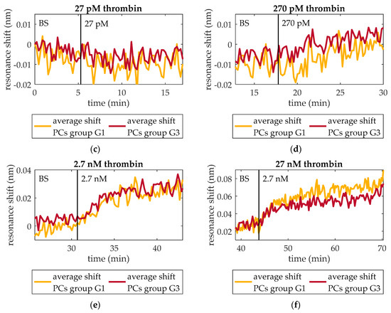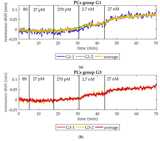 It is also remarkable that these results are consistent to those obtained from detection assays of discrete concentrations in Section 3.1. In this assay, when flowing 2.7 nM thrombin, the average total net shift showed by PCs group G1 is 36 pm and by PCs group G3 is 34 pm, similar to those observed in Figure 6 (39 pm and 30 pm, respectively). When flowing 27 nM, PCs group G1 shows an average total net shift of 88 pm, which is also very similar to that observed in Figure 4 (97 pm). Only PCs group G3 shows an average total net shift notably different from that observed in Figure 4 (78 pm vs. 166 pm). This difference is attributed to the different density of bioreceptors on the surface of PCs group G3 when 27 nM thrombin detection is performed in Section 3.1, as it was already discussed then.
