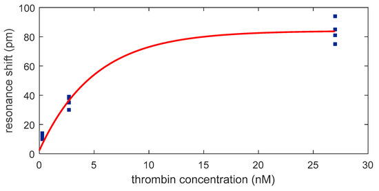By plotting the resonance shift against the concentration of thrombin, an exponential relation is obtained (Figure 8) with the correlation equation (R2=0.99):