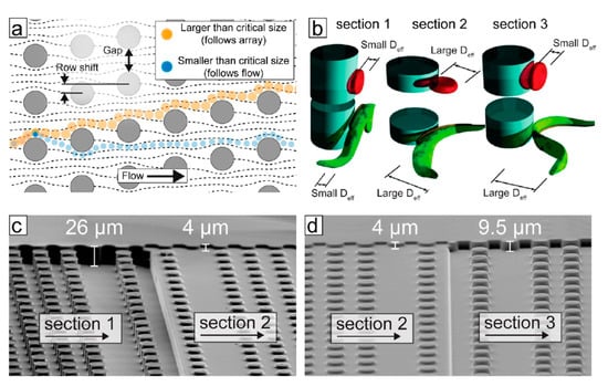 The principle the “naïve model” of deterministic lateral displacement, on the example of trypanosomes and red blood cells. (a) An array of posts divides a fluid-flow into many well-defined streams. Particles smaller than the critical size follow the streams, whereas larger particles follow a trajectory defined by the geometry of the array. (b) The effective size of particles is a function of their shape and orientation as they flow through the device. Device depth can be used to control the orientation of blood cells and parasites to maximize differences in effective sizes. (c,d) Scanning electron microscopy images of a poly(dimethylsiloxane) (PDMS) device, designed to separate trypanosomes from blood cells; the different sections achieve different separation steps. Adapted with permission from [8].
