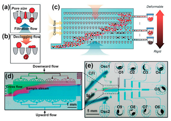 Design of the ratchet-sorting device. (a,b) Tapered funnel constriction allowing unidirectional flow of cells under oscillation excitation which consists of (a) upward filtration flow and (b) downward de-clogging flow; (c) cell sorting using a matrix of funnel constrictions. The cell sample is introduced through the sample inlet (SI) and forms a diagonal trajectory under the combined forces of cross-flow inlet (CFI) and biased-oscillation flows including oscillation inlet 1 (Osc1) for de-clogging and oscillation inlet 2 (Osc2) for filtration. More deformable cells, such as RBCs, will travel further up the matrix of funnel constrictions than less deformable cells, such as iRBCs, which will be blocked midways and be separated from the main population. (d) Image of microfluidic ratchet device infused with different food color dyes illustrating the diagonal trajectory of the SI through the ratchet-sorting device constituting a deformability gradient. (e) Image of the overview design of the ratchet sorting device as well the nine outlets (O1–9). Adapted with permission from [112].