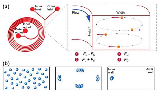 (a) Schematic of a spiral micro-particle separator. The design consists of two inlets and two outlets, with the sample being introduced through the inner inlet. Neutrally buoyant particles experience Lift forces () and Dean drag (), which results in differential particle migration within the microchannel. (b) Microchannel cross-sections illustrating the principle of inertial migration for particles with . The randomly dispersed particles align in the four equilibrium positions within the microchannel where the Lift forces balance each other. Additional forces due to the Dean vortices reduce the four equilibrium positions to just one near the inner microchannel wall. Adapted with permission from [125].