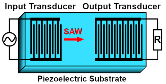 Interdigital transducers (IDT) (black) used to generate surface acoustic waves (SAW) on a piezoelectric carrier material. The input transducer generates mechanical forces from electrical voltage, while the output transducer can re-convert the mechanical oscillations into an alternating voltage.