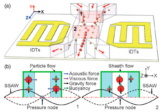 - Destgeer, G.; Lee, K.H.; Jung, J.H.; Alazzam, A.; Sung, H.J. Continuous separation of particles in a PDMS microfluidic channel via travelling surface acoustic waves (TSAW). Lab Chip 2013, 13, 4210–4216. [Google Scholar] [CrossRef]