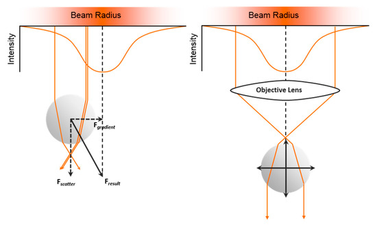 Light can interact with matter on the microscopic scale, as proven by Arthur Ashkin almost five decades ago [139]. The operating principle of optical tweezers is rather simple (see Figure 8), as demonstrated on laser light (orange) and a transparent spherical particle. A normal laser beam has a roughly Gaussian intensity profile (see orange intensity profile top left in Figure 8) and parallel rays of photons. If these rays enter a spherical particle of higher refractive index (e.g., a glass microsphere) the photons get refracted and in turn exert a force onto the sphere. Since there are more photons per interval where the intensity is higher, the sphere will pulled towards the center (by the gradient force , see Figure 8) and pushed along the propagation of the laser beam (by the force of the scattered photons ).